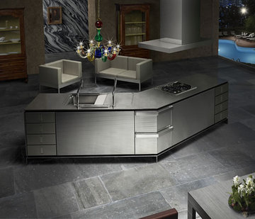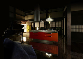 アイランドキッチンの新しい提案135°の「V-LAND」とパトリシア・ウルキオラのデザインによるシャンデリア照明「CABOCHE」を同時展示。