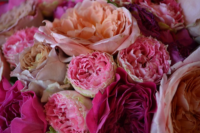ピンクと一口に言っても千差万別。今回はアンティーク調の木目に合わせて、落ち着いたトーンのお花を選びました。ほんの少しベージュ色のエッセンスを足すのがポイント。