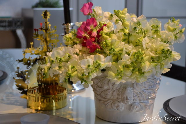 両手いっぱいのスイートピーを、食卓に飾りました。