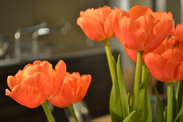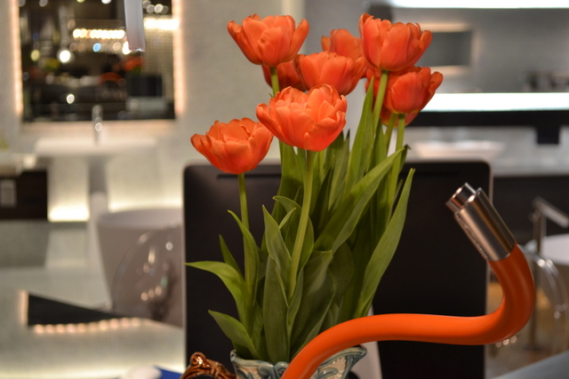オレンジ色のチューリップに、フレキシブルに曲がるオレンジ色の水栓。