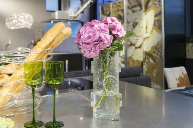 紫陽花を生けるのは、涼しげなガラスベースにはりつく水玉が特徴的な「ホールドオンクリアトールベース|Hold On Clear Tall Vase」。