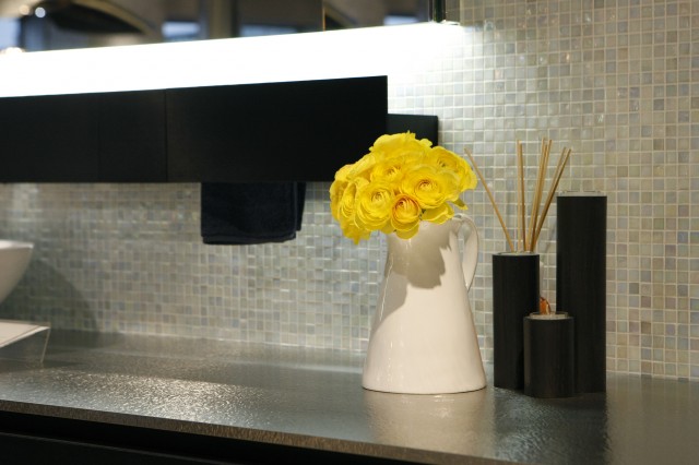 光を反射しキラキラと美しく輝くアイス柄トップのキッチンの上で