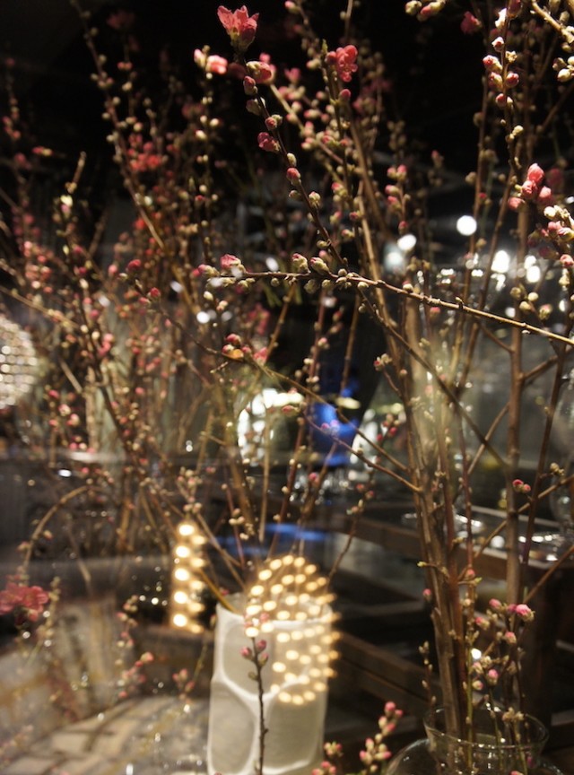 桃の花に染まったショーケースからは、春の訪れをすぐそこに感じます。