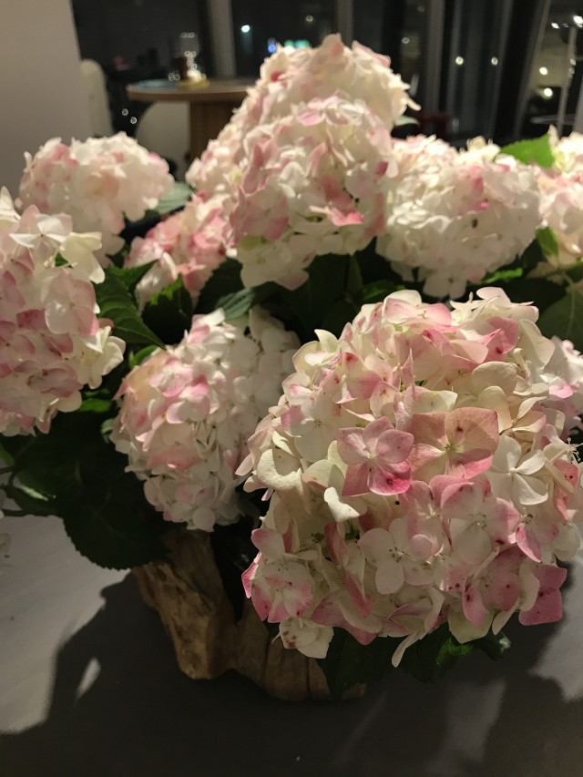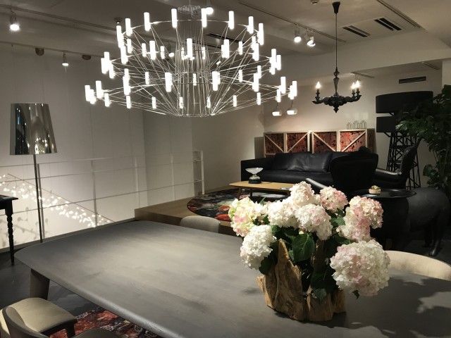 日本人デザイナーが手がけた新作の照明「コッペリア」で装ったダイニングには、この季節を彩り癒す紫陽花。