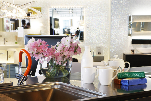 キッチンを中心としたインテリア空間に、お花やグリーンを取り入れた新しい試みのショールームです。