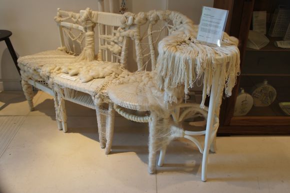 これも不思議な椅子というか、複数の椅子とサイド・ボードを布や飾り紐で結びつけて一つの長椅子に表現した家具。