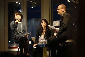 向かって左から長山智美さん、通訳の女性、セバスチャン・ロングです。