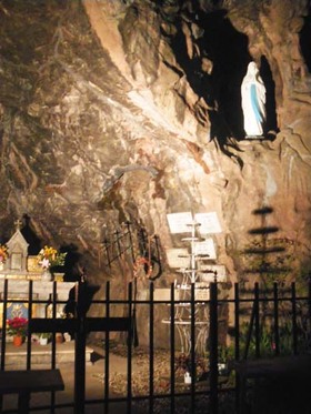 ところが、この「東京カテドラル聖マリア大聖堂」は、いったん敷地奥の方「ルルドの洞窟」に向かって進み、それから転回するようにして階段を上り聖堂に至るというものです。