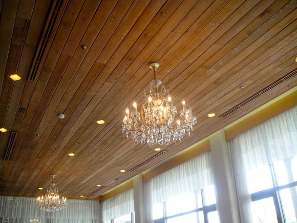 木目の天井とクリスタルのシャンデリアの組み合わせが新鮮に感じた。