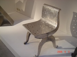 まず、サローネで発表される製品の多様性はどこからもたらされているのか?2万種類の新製品は当然ですが似たような製品はあるのですが、なんせ2万種類なのでその多様性といったら想像を絶します。では、この多様性を可能にする産業システムはどうなんたろう?また市場としてこの多様性を受け入れる事が出来るイタリアのマーケットとはどんな市場なんだろう?興味は尽きません!!写真はハンドメイドの臭いがプンプンするブリキの椅子。これもれっきとしたメーカーの商品