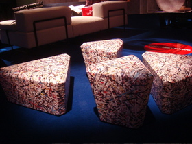 左の写真はシュレッダーからゴミとして排出された紙を固めたイメージのスツール。シュレッダーから偶然に出たゴミを固めても、こんなカラリングにはならないと思うので、使う紙の色はかなり計算されているものと思う。でも、イメージとして捨てられたものを再利用しているというデザインのイメージは感じられる。