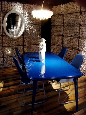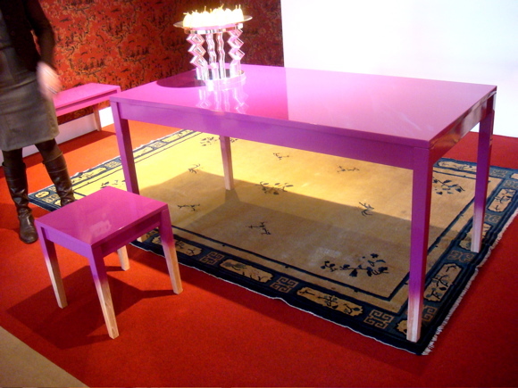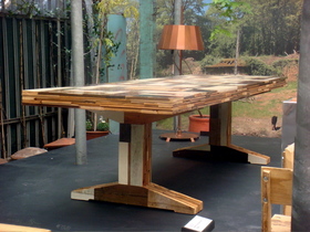 上の写真は足の部分が水没して、塗装が剥げてしまったというイメージのテーブルと椅子。これも、やはり捨てられてしまったものの美しさをもう一度見直して再利用するというデザイン。エコ・デザインもこういった切り口もある。