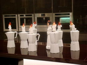 ユーロクッチーナのあるブースに置いてあった七人の小人と白雪姫のコーヒーポット。