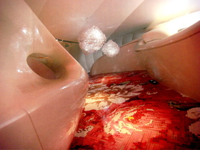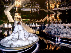 ミラーが張り巡らされた曲線で構成された部屋の中央には一見泡のようなアクリルの塔がそびえている。泡の塔の先端には捨て去られたようなものが吹き出している。