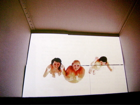 空間に空の段ボール箱が散乱している。中を覗くと、箱の底には映像が流れている。まるで中に不思議な小宇宙が広がっているような錯覚に陥る。流れている映像は白い床に裸の女性が動いている。そのうちの一人はかなり太っているのだけど、その女性の存在が何か映像から現実感を奪っている。