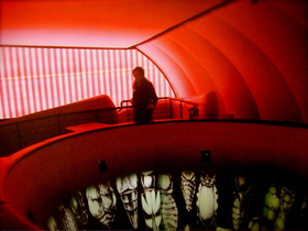 次の作品を見るには階段を登る。階段の先には穴があり、その中を覗くと不思議なモノクロの深海風景のような映像の世界。作家は日本人の女性アーティスト束芋(たばいも)。ここでもその穴をひたすら覗きながら彼女の世界に埋没していく。