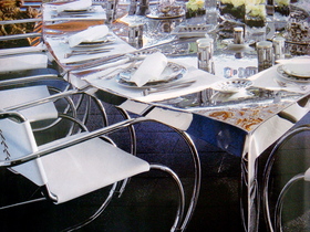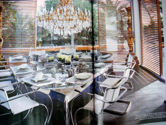 自宅のダイニング・スペース、 シャンデリアが凄い!、テーブルはロンアラッドの一点もの。このテーブルもクローム系、クローム系はこれからのインテリアのトレンドになる兆候がここでも見られる。