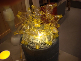ペット・ボトルのシャンデリア。使い古したペット・ポトルが豪華?なシャンデリアとして甦る。ちょっとしたジョークともとれる作品。でも、これも量産は出来ない。