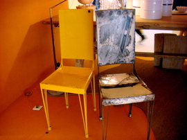 捨てられていた鉄板を使って作られたように見える椅子。川窪怜のゲリラ・ショップを思い出した。代官山の「Color by Numbers」というラブレス系のアパレル・ショップや、最近改装した南青山の「UnderCover」も使い古したビニール・コーティングした鉄のワイヤーが、錆びたままの状態で内装に使われている。うちの六本木の「TOYO KITCHEN Meuble」でも、ポテチーノの呼ばれる大理石の石ころを納めてるのは、わざと錆びさせたワイヤー・ケージ。