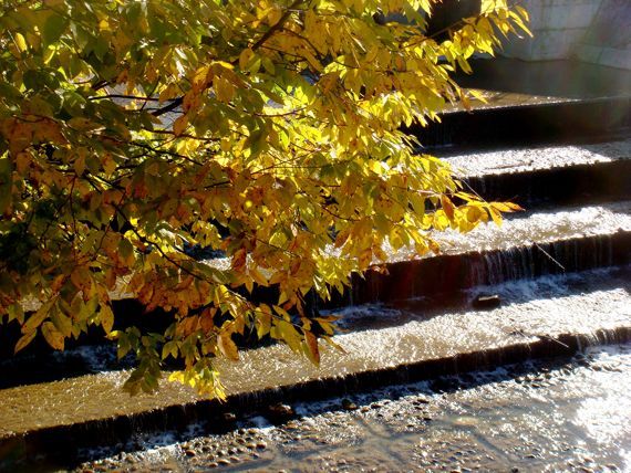 妻籠に沿って流れる蘭川を覆うように垂れ下がる黄色く紅葉した葉が美しい。