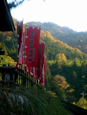 豊川稲荷の赤い旗が山の紅葉をバックにはためいている。
