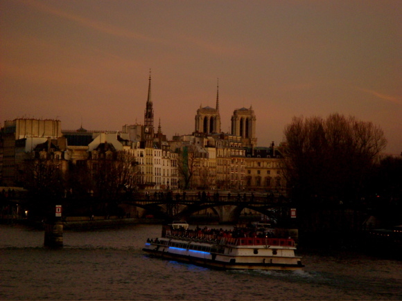 ルーブルからサンジェルマンに向かう橋の上から東のノートルダム寺院を眺めた写真。夕焼けの赤に染まりつつあるノートルダム寺院の塔が美しい。