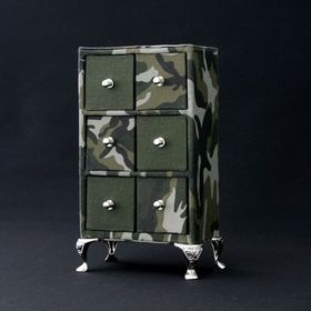 もう一つは迷彩柄のミニチャー・チェスト、、、勿論小物入れになるような小さな引き出しが6つついています。引き出しは小さいので、指輪やちょっとしたアクセサリーなんかを入れて使うとなかなか可愛いと思います。このチェストにも猫足がついていて、これもなかなか良いと思いました。