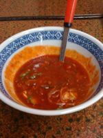 この朝日屋、お刺身を中心とした魚料理なら殆ど網羅しているのですが、私がお目当てなのはそういった魚料理そのものではなく、刺身に浸ける「韓国風のコチジャン・ベースのタレ」なのです。写真には「ひらめの活き造り」と、その前の鉢に入っているのがその「秘伝のタレ」。