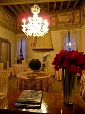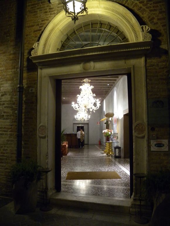 上の写真はホテルの入り口からフロント方向を見たもの。ベネツィアンガラスのシャンデリアと床のモザイクが印象的。