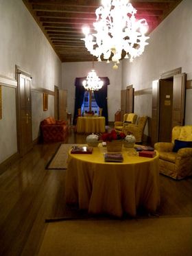 二階に上ると、センターホール(左)と、ダイニング・ルーム(右)があり、ここは板張りの床に同じくベネツィアングラスのシャンデリア。