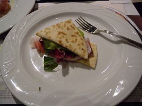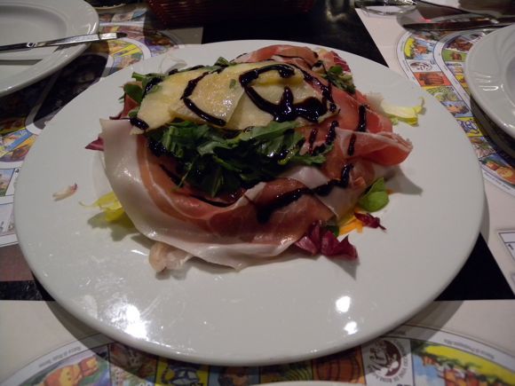 席について廻りを見回すと、上の写真のようサラダ・ディシュが乗ってるテーブルが多かった。地元で穫れた野菜の上にスライスしたパルメジャーノと生ハム、その上からドロッとしたバルサミコ酢がかかっている。