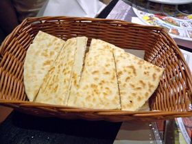 左の薄く焼いたパンのようなものに、サラダを挟んで、右の写真のようにサンドイッチにしてガブリと食べる。