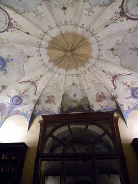 レストランのエントランス・ホールは少し天井が高くなっていて、天井にはフレスコ画のカラフルな文様が描かれていた。