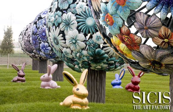 SICISの工場の前庭にはモザイクで作られた花の木が飾られている。