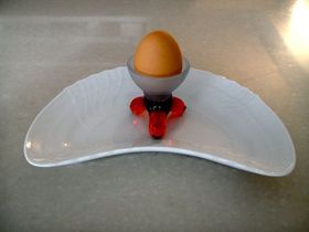 出来上がった卵を以前にShop Toyokitchenで取り扱ってた、ベネツィアングラスのゆで卵乗せに入れて食卓に出す。このゆで卵乗せ、色が、赤、青、黄色、透明と4種類あり、毎日色を変えて楽しんでいる。