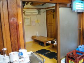こうやって板の間の部屋に座って頂くのが韓国風らしい。