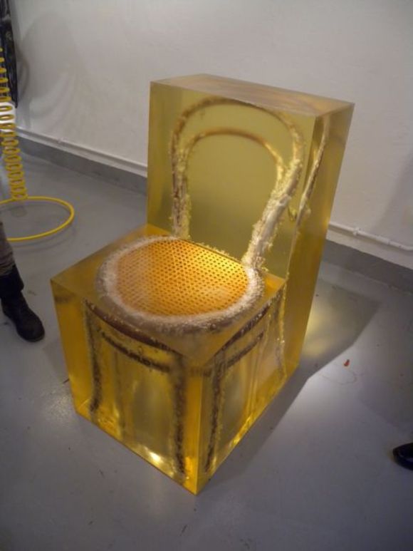 上の写真は椅子を樹脂で固めたもので、韓国のデザイナーの作品です。デザイナーの名前は忘れました。ともかく、椅子としての機能を放棄した製品で、まさにアート家具の典型ですね。椅子が氷詰めになった製品もありましたが、同じ作家のものかは不明です。