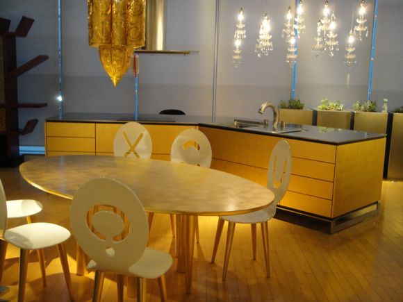 この企画は数年前のミラノサローネでアンナ・ジリのゴールドの椅子とテーブル(トランポリェーレ)に出会った時から始まりました。当時「和」に合うキッチンというのが一つの開発のテーマだったので、このゴールドの家具を見たとき、イタリアの女性デザイナーの作品でありながら、「和」を強く感じ、GOLDをテーマとした「和」とコーディネート出来るキッチンの開発が始まりました。