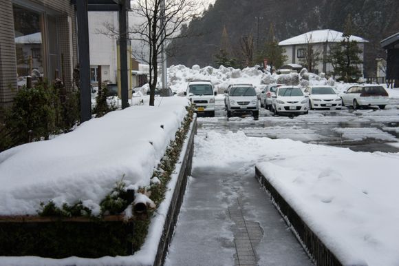今庄に到着した日は雪は少なかったのですが、翌朝起きるとしっかり新雪が積もってました。