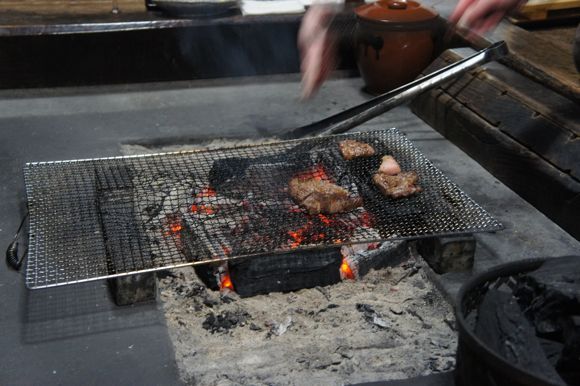 写真のように囲炉裏で直接に肉を焼いて貰います。