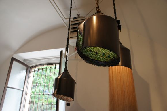 内側に孔雀の羽根を敷き詰めたペンダント・ライト