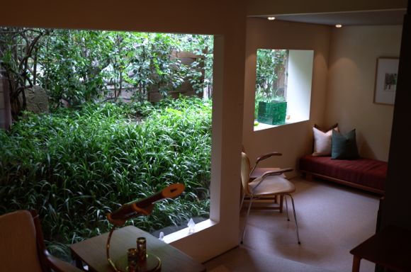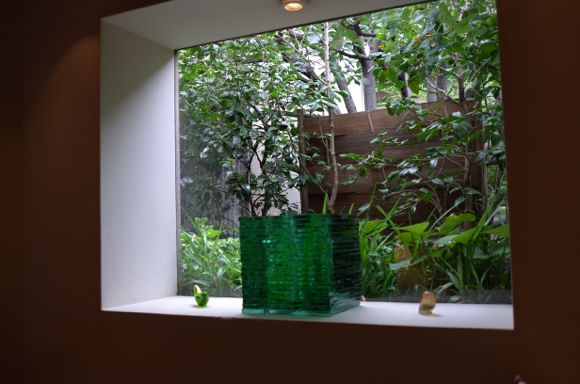 ガラスの端面の緑が庭の緑に溶け込んで美しい。