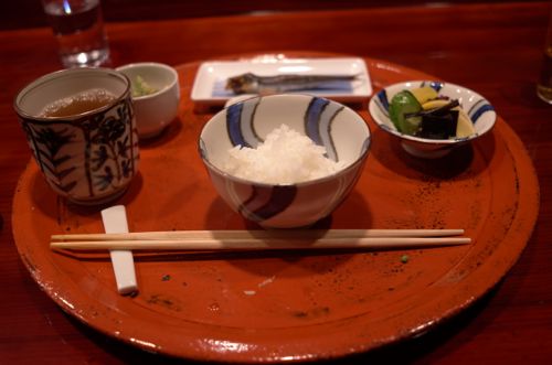 最後の料理、、〆とでも言うのでしょうか、これが独特で「炊きたてのご飯」と「お漬け物」と「メザシ」