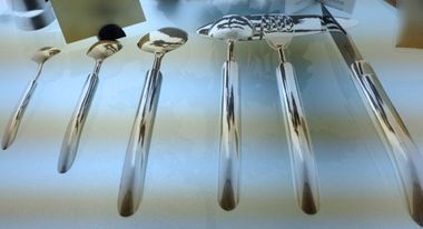 写真はミッシェル・ブラスで実際に使われているシルバーのラギオールのディナーセット。