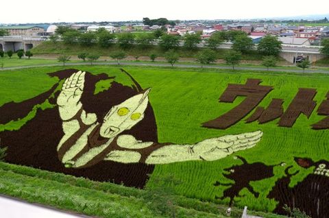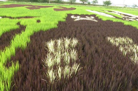 TITLE:「田んぼ」アートって? 2013年8月11日 弘前から黒石に向かう途中に「田んぼアート」と書かれた看板を見て、気になって車を止めて見てきました。 200円払って、塔の上から見るとこんな感じてす。 ちょっとピックリです。 下に降りて見るとこんな感じです。 全て稲で、品種の違う稲をパターンに沿って植える事で色々な模様を描いています。 面白い事を考えるものだとチョット感心した次第です。