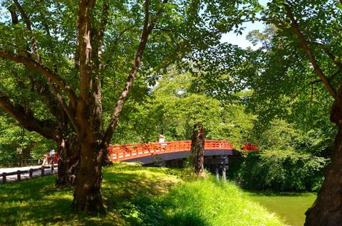 桜の巨木とお堀にかかる朱に塗られた橋がとても印象的です。