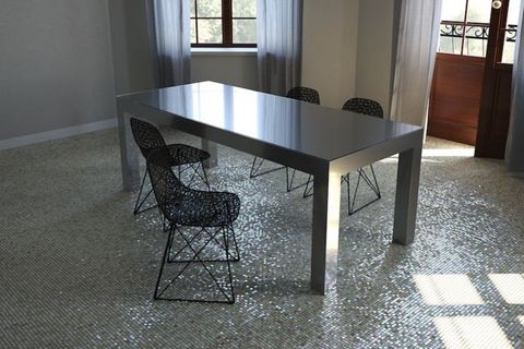 TITLE:好評の「銀嶺」にステンレス・バージョンが登場します 2014年4月12日 好評の「銀嶺」テーブルに今回ステンレス・バージョンを追加します。 間口も1500,1800,2100,2400mmと4サイズに増えました。 デザインはステンレスの持つソリッド感を表現したデザインになっています。 これも人気がでるでしょうね。