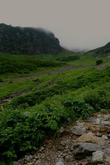 その後、雨は降ったり、止んだりだったのですが、見上げると山頂はすっかりガスがかかって何も見えません。
