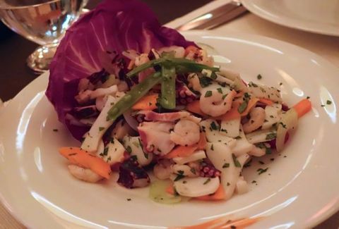 子イカのフリットとシチリアの白ワインをグラスで戴く。
