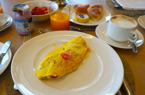 オレンジジュース、オムレツ、ヨーグルト、苺、パンとエシュレのバター、そしてお約束のカップチーノ